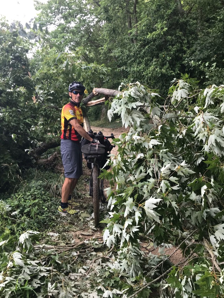 The third day brought more debris on the towpath. A rider cycling the opposite direction told us that at mile post 88 the trail was impassable and to turn around. Ummmm just no.  We pushed on and climbed over, ducked under or plowed through the obstacles.