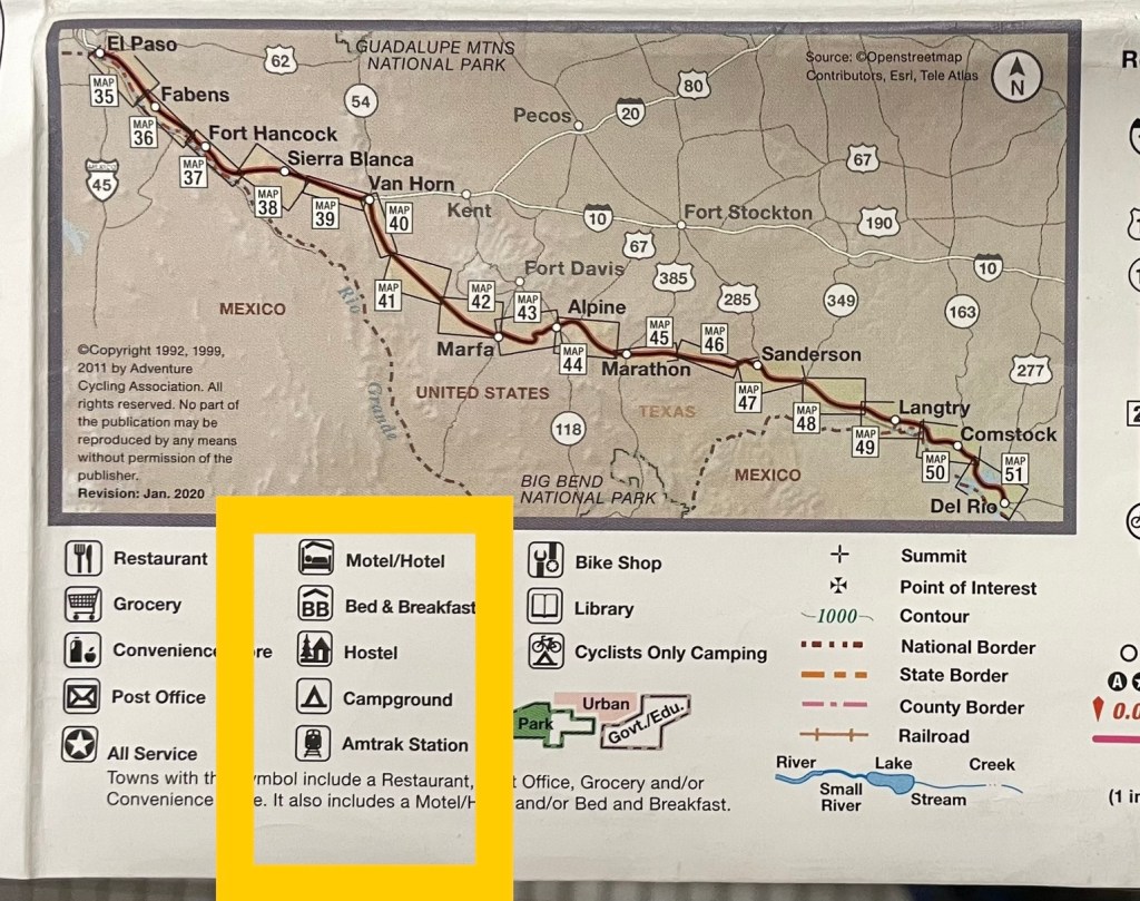 2) Look at our maps. The Map Legend shows where hotels and campsites are located. See the picture below of one of our map panels for tomorrow. There are lots of campsites but not many hotels.