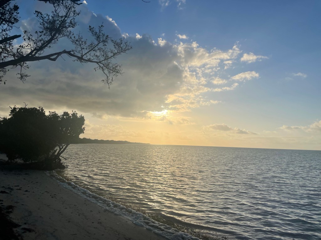 It was another near perfect day of cycling but the icing on the cake was the sweet tent site Tom found at Long Key State Park where the sites are walk-in only and beach front. Past hurricanes have shut down the regular camping area so it’s quiet with only four beach front camping sites.
