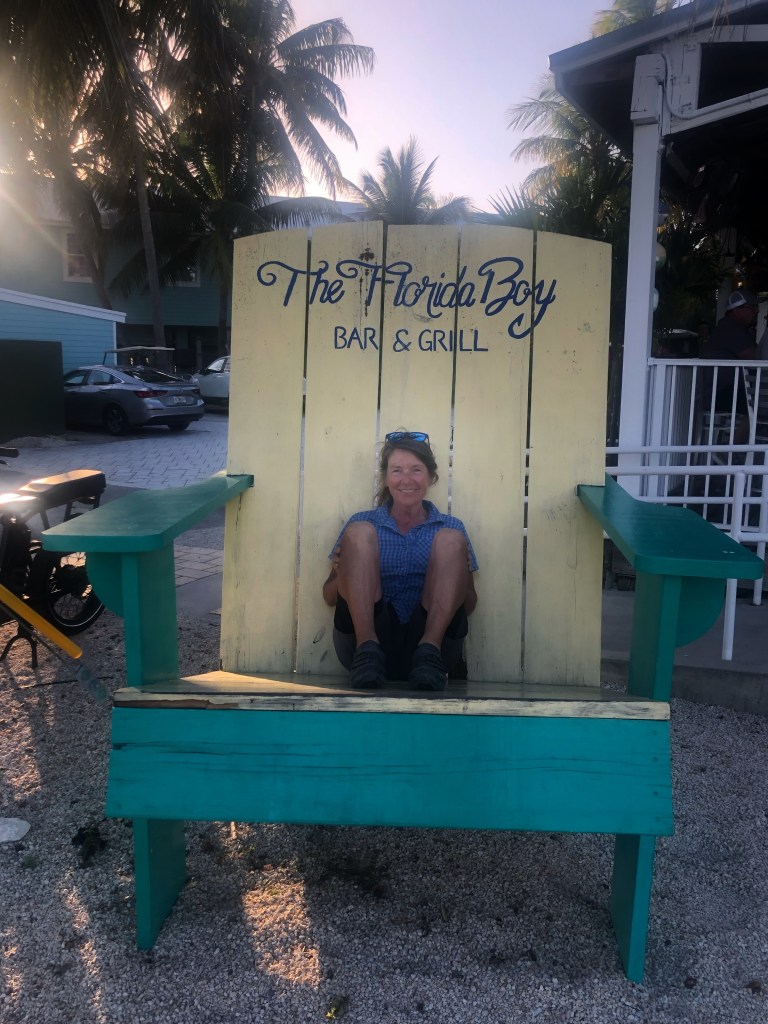 We got all checked in and then cycled back a mile to get a bite to eat and a bevvie or two. There must be something about big chairs in Florida. I don’t quite understand it but we most always stop and take pics.