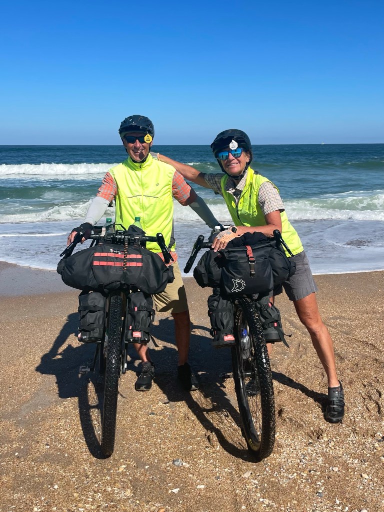 Although the official Southern Tier bike route ends in the city of St. Augustine, we crossed the bridge to get to St. Augustine Beach where we dipped our front tires into the Atlantic Ocean as we dipped our back tires in the Pacific Ocean 56 days ago.