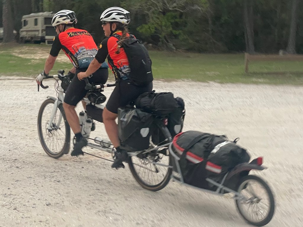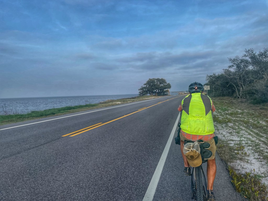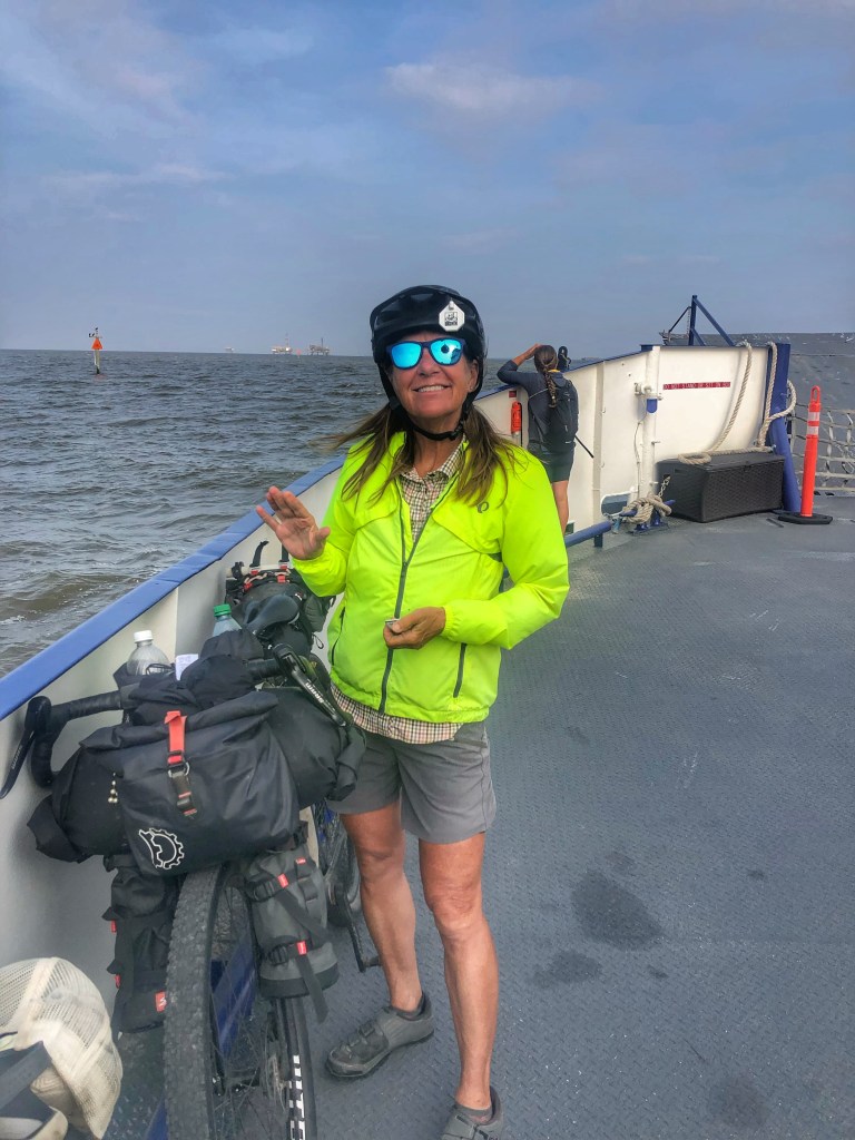 After a 40 minute ferry ride, we cycled east through Gulf Shores to our campsite and arrived just before nightfall.