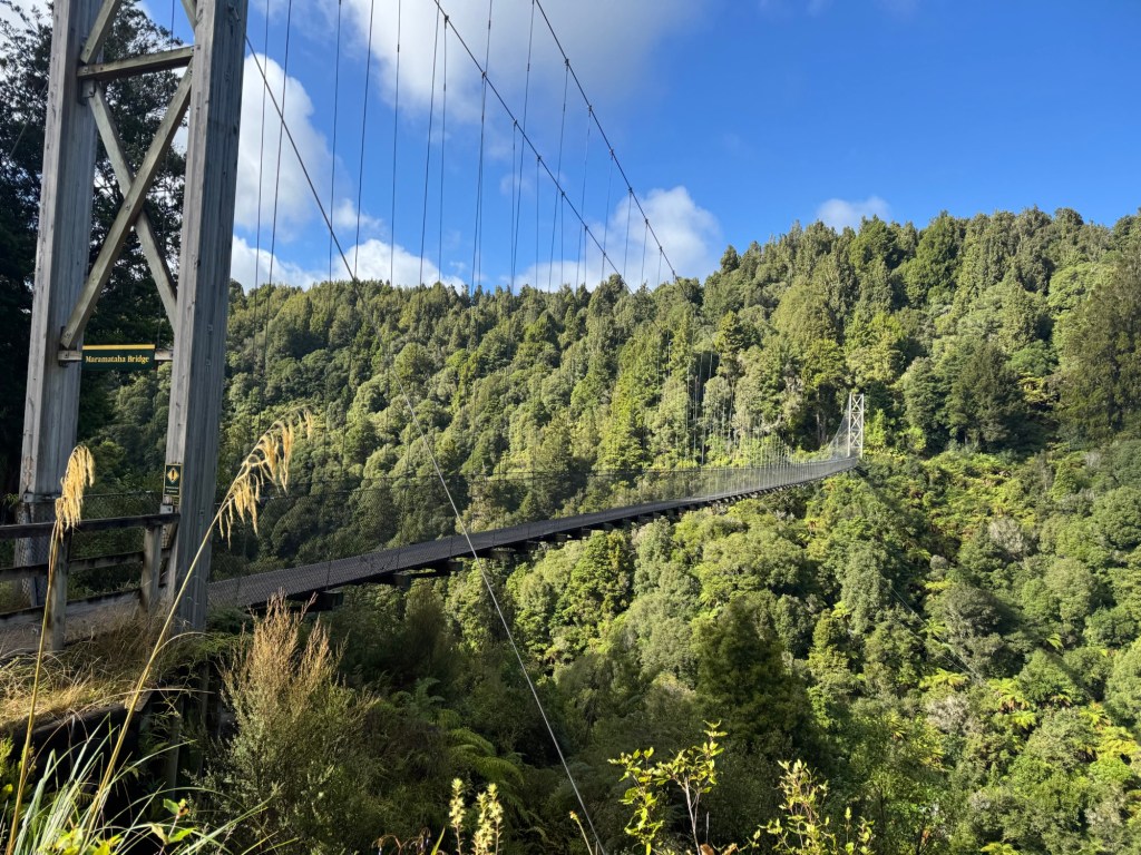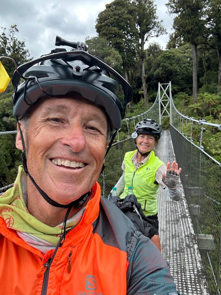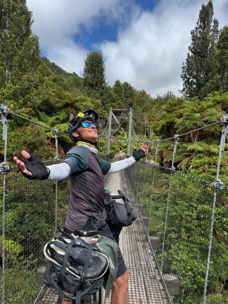 Shortly after a flowy single track on the Waikato River Trail we crossed our first swing bridge.