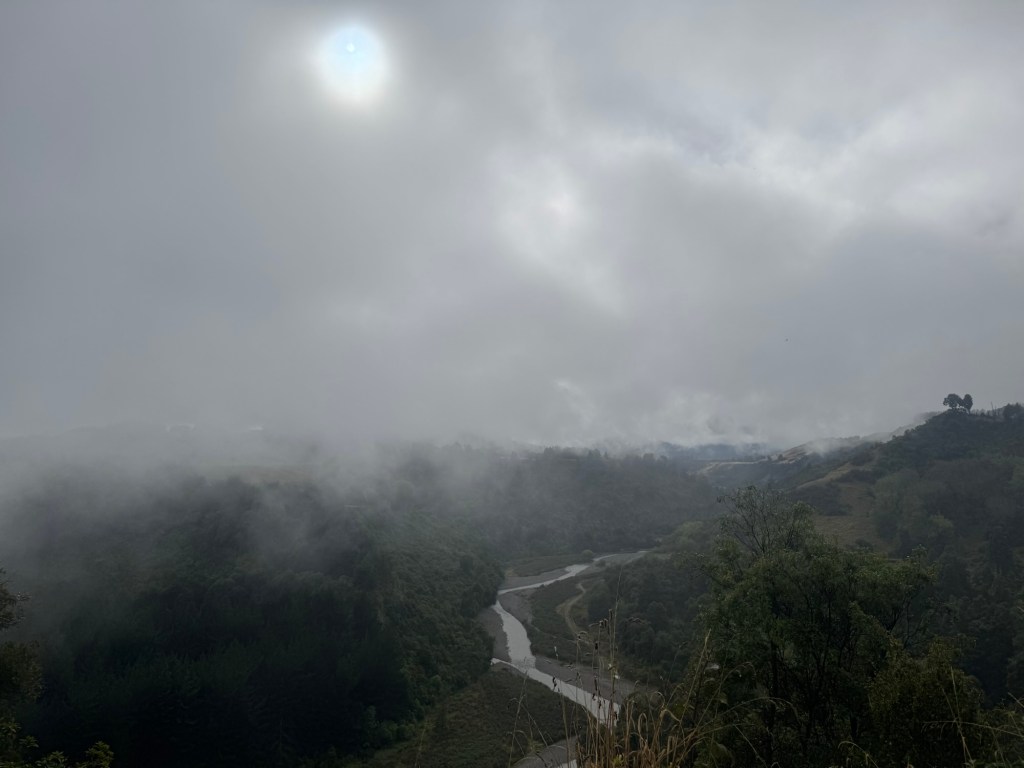 And since we camped at higher elevation last night, it was colder and foggier than most mornings. The fog and clouds made for a magical feeling as we began our day of cycling. Ya we just climbed all the way up from that road down there.