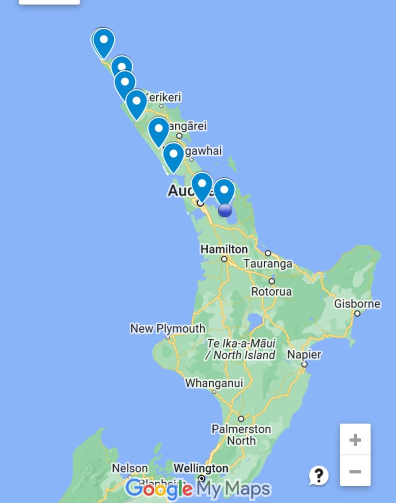 Here down under we have now crossed the North Island latitudinally and are enjoying views on the east side of the country along the Pacific Coast Highway. I put a pin where we stop every night to plot our progress on the Route Tracker at night.