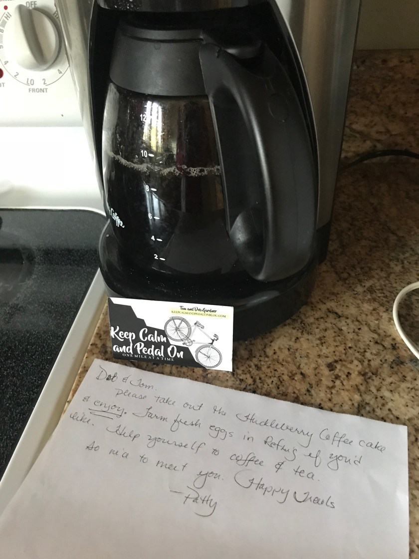 It got chilly last night but we slept like babies, although we didn’t cry like babies when Tom gave the tires a feel and discovered a rear flat. I cooked some breakfast while he quickly changed it.