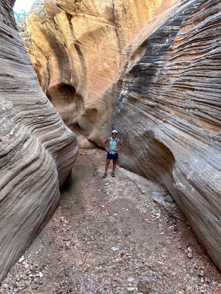 We stopped for a trailside snack, got up and began our hike back. That’s when we heard the thunder, looked up and saw the weather was turning. Rain was coming. Most everyone knows the worst place to be when rain comes is in a slot canyon.